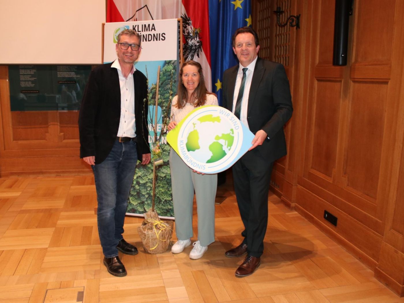 v.l.: Klimabündnis-Geschäftsführer Andrä Stigger, Gemeindemitarbeiterin Angelika Berger und Landesrat René Zumtobel. Foto: Klimabündnis Tirol